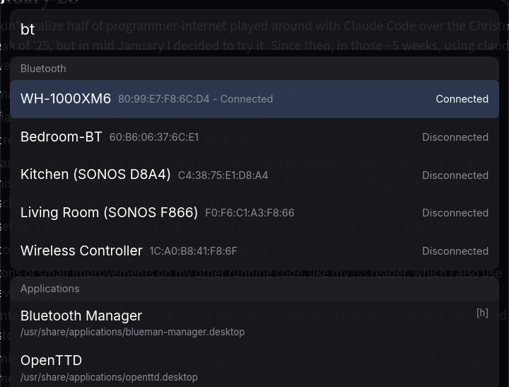 - largely vibecoded a launcher (think Raycast) with a calculator, color picker, clipboard history, volume management, brightness controls, bluetooth handling, todo list, train schedule, and more. I use this every day.